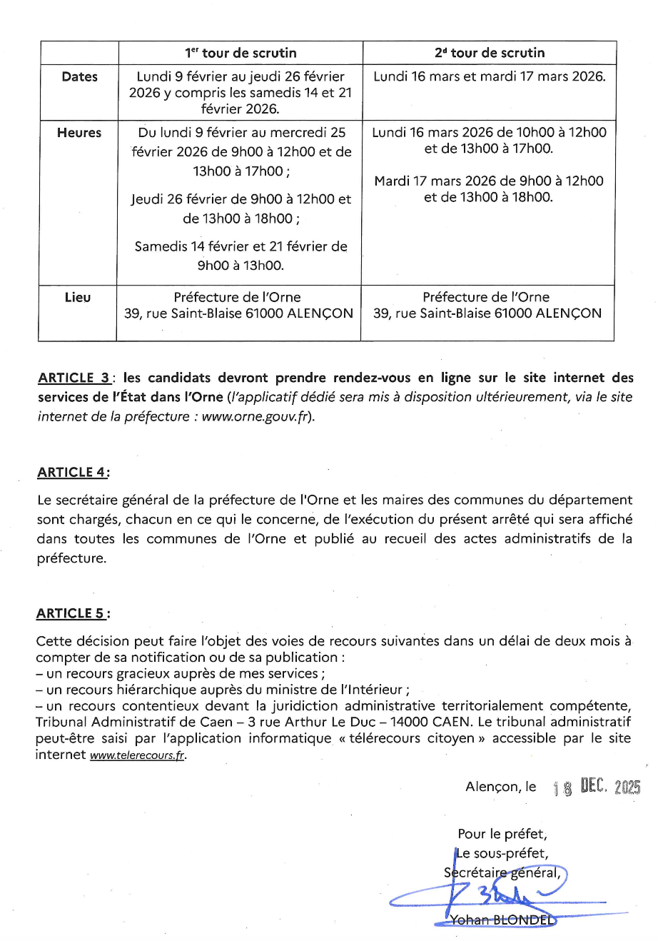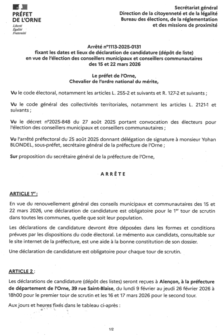 Arrêté n°1113-2025-0131 fixant les dates et lieux de déclaration de candidature (dépôt de liste) en vue de l’élection des conseillers municipaux et conseillers communautaires, des 15 et 22 mars 2026
